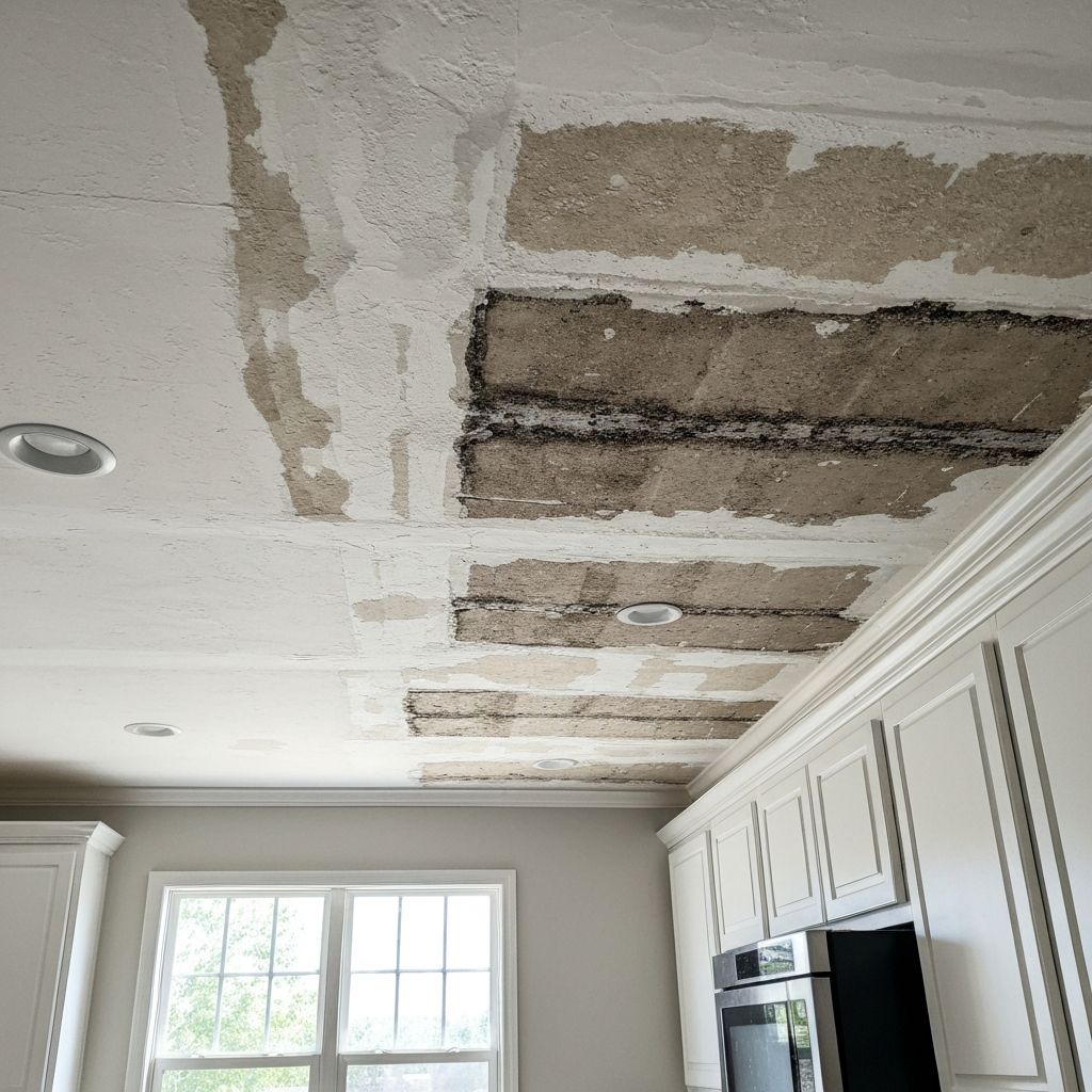 Water damage from a roof leak caused significant drywall deterioration and mold concerns. The ceiling had visible staining, sagging sections, and compromised structural integrity.